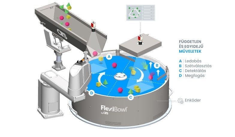A FlexiBowl® rugalmas adagoló alkatrészek tájolására és szétválasztására alkalmas, kihasználva a szervomotor és az impulzusgenerátor által működtetett forgó sík mozgását.